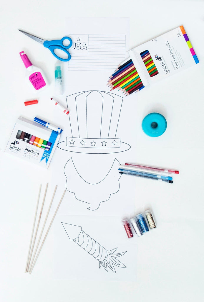Supplies You’ll need: Yoobi scissors, tape, twisted crayons, colored pencils, mini washable markers, liquid glue, a glue stick, glitter shakers, and wooden sticks. DOWNLOAD TEMPLATE HERE
