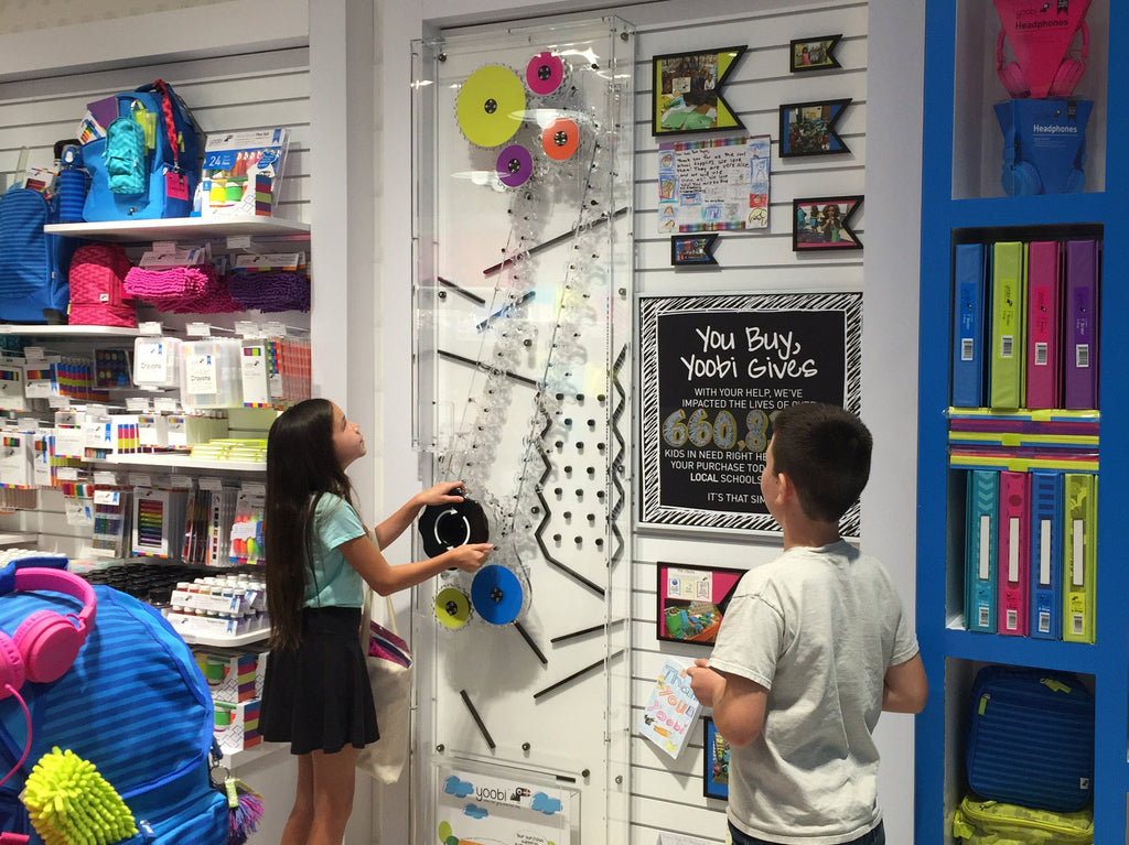 To really hit home on how important our “give” aspect is, the Yoobi store has an interactive wall showing just how we help kids in need. When you purchase a product at our store, we give you a token to take to our give station. Plop the token in the slot, turn the wheel, and watch your purchase in motion, going directly to our token tank - representing how you're helping kids in need all over the U.S. Come in and try it for yourself!