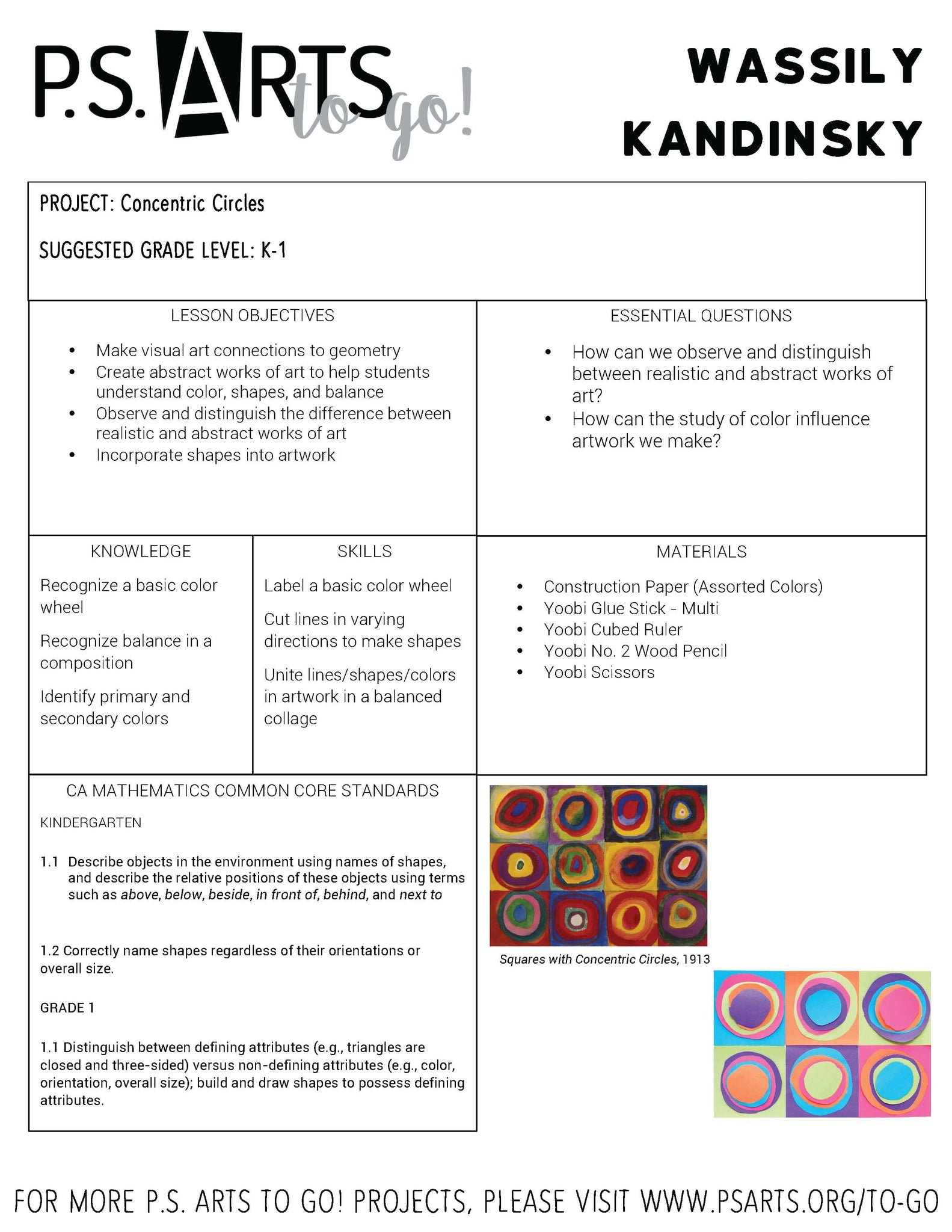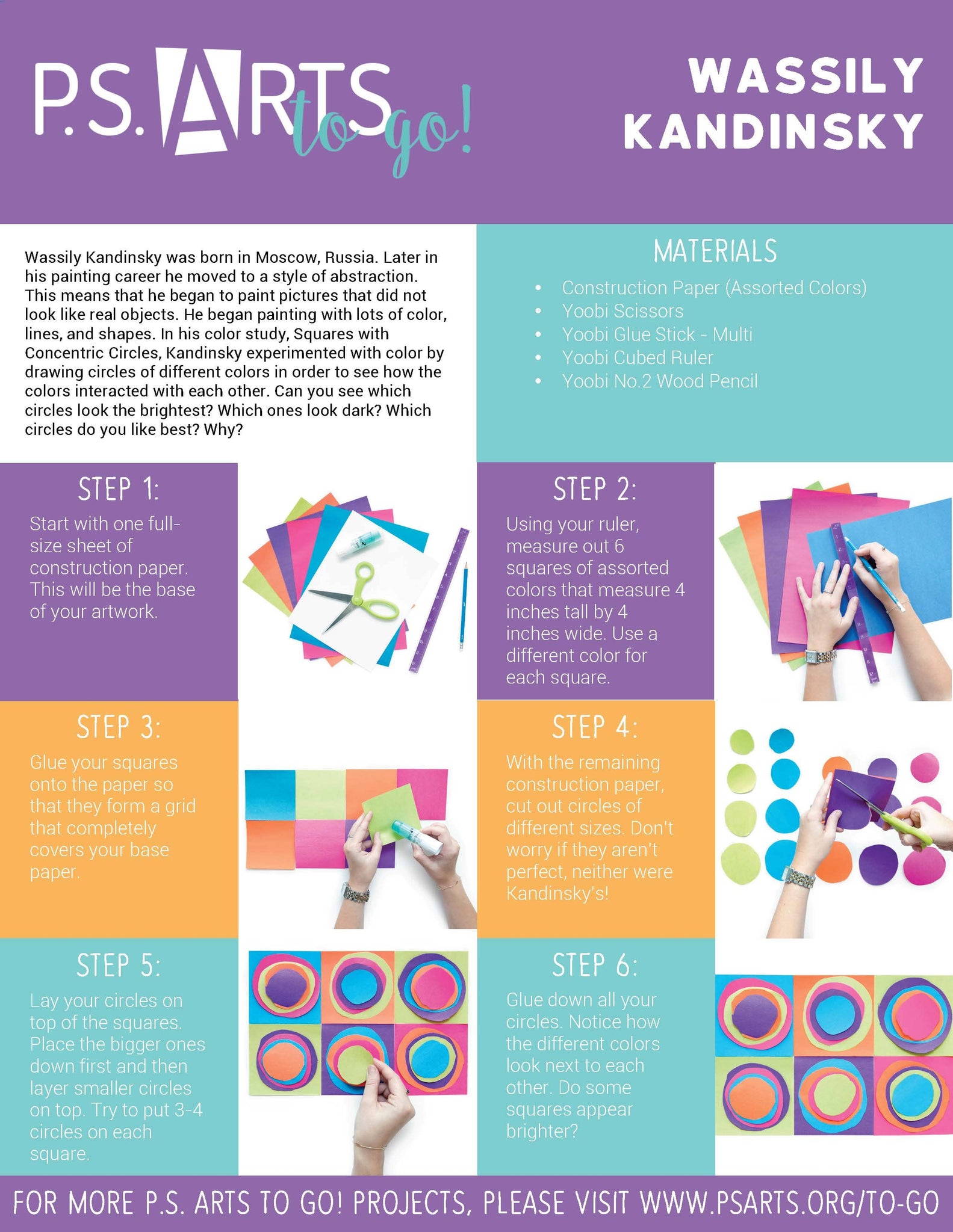 P.S. ARTS features a ton of fun resources for students, parents, teachers, and schools/districts on the website. One of our favorite resources are the “To Go!” projects inspired by artists around the world. These projects are made so that they are easily accessible by creatively using basic art supplies. Each “To go!” project includes a set of instructions that helps children create their own spin and be their own Monet! Together, Yoobi and P.S. ARTS have created the PERFECT project for school OR home, referencing the beautiful work of Kandinsky. Check out our step by step below: