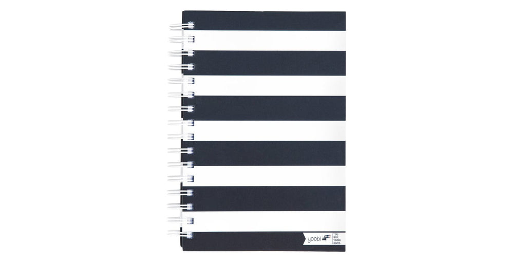 - Black and White Stripe Notebook: On-the-go and need something to take quick notes in? Yoobi has your answer with this small black and white stripe notebook that you can easily take with you anywhere!