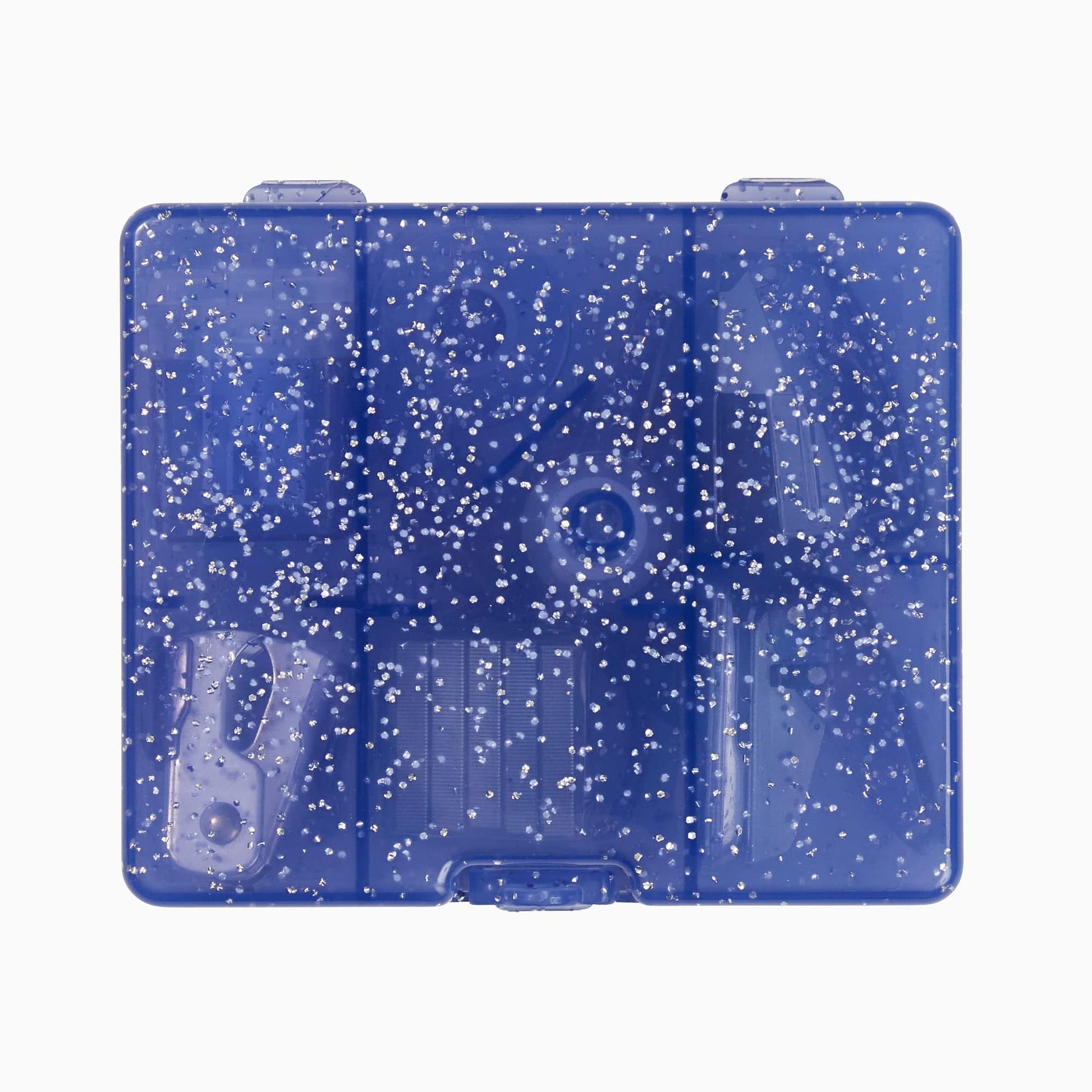• Includes: stapler, staples, staple remover, hole punch, tape dispenser, tape, scissors, pencil sharpener, glitter infused case, and kid scissors with blade cover