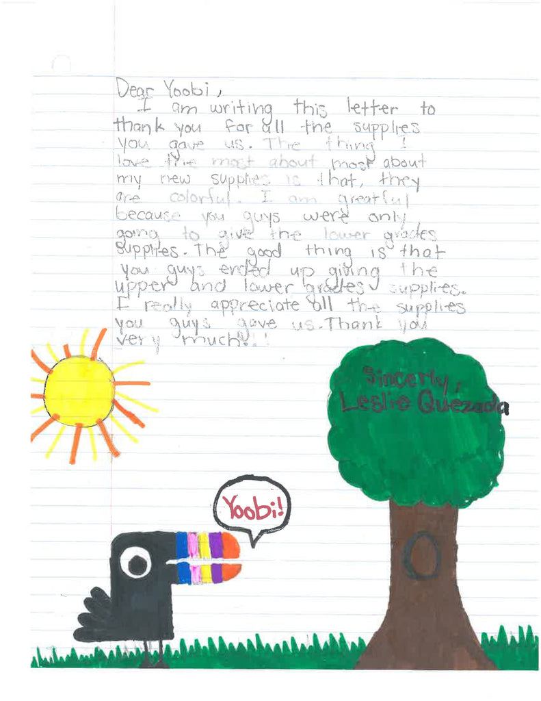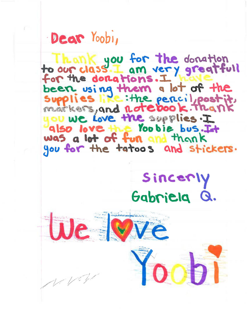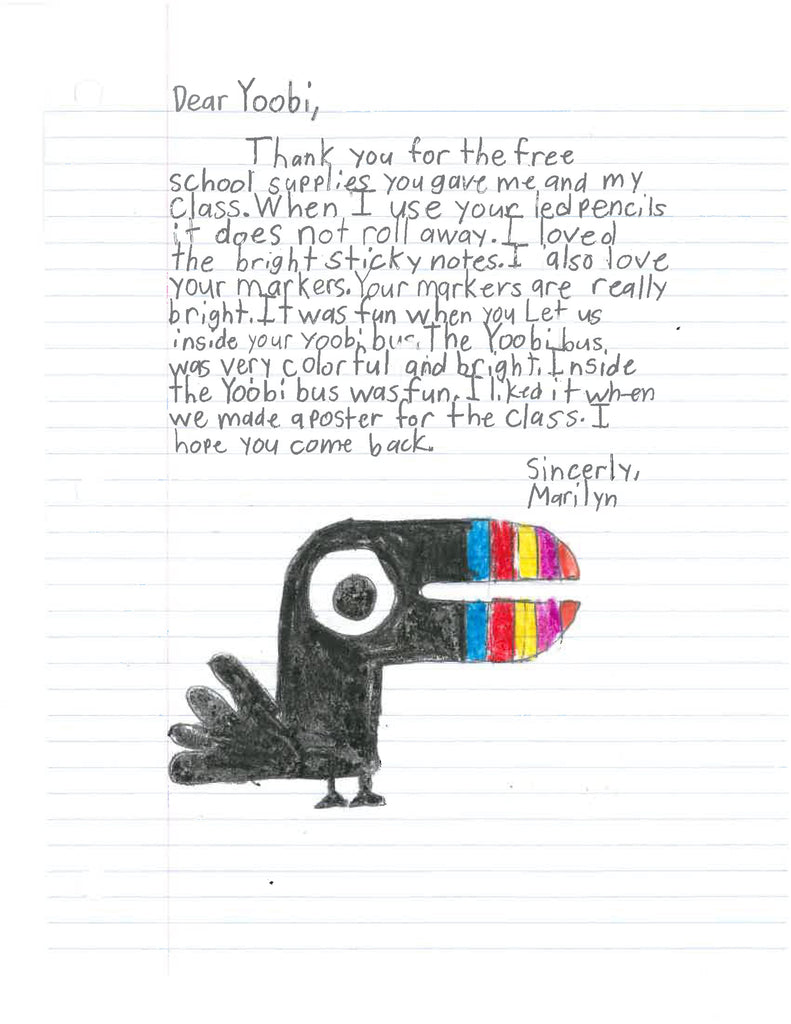 Our mailbox is loaded with thank you notes here at Yoobi. The amazing artwork, stories, and thoughtful messages we receive bring smiles to our faces day after day! Here are a few of our favorites. You too can share artwork, stories, and notes. Email us at stories@yoobi.com or send them to Yoobi HQ for a chance to be featured!